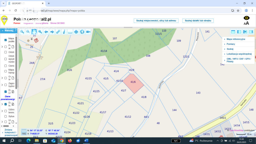 - Media: prąd w drodze, woda w odległości ok. 200 m