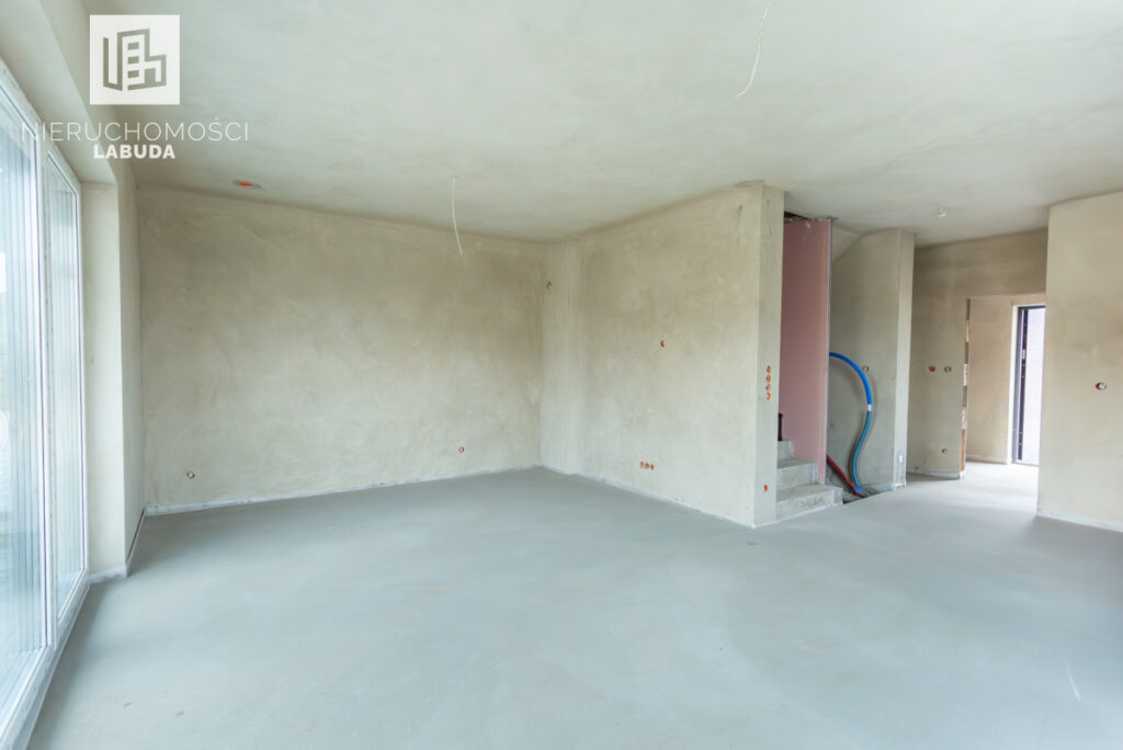 • Salon z aneksem kuchennym, wyposażony w panoramiczne okna z wyjściem na taras oraz ogród.