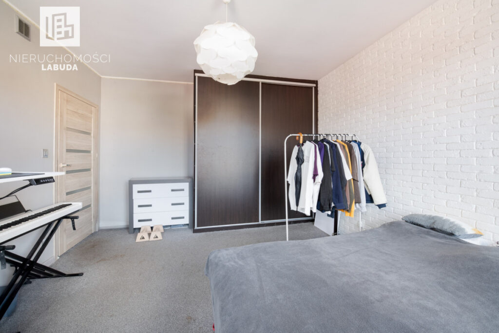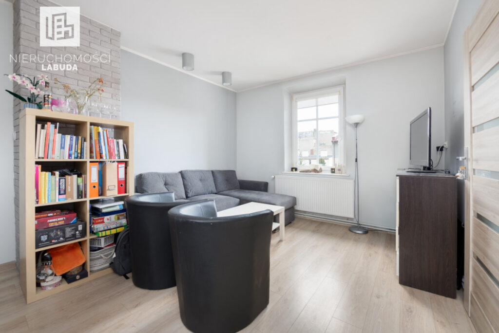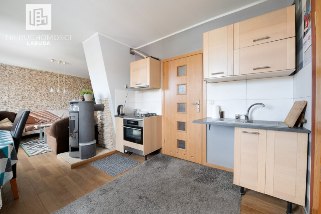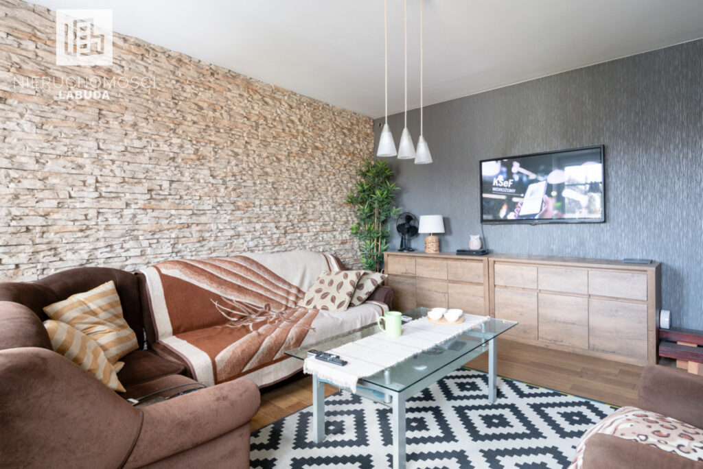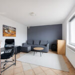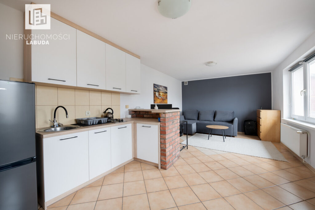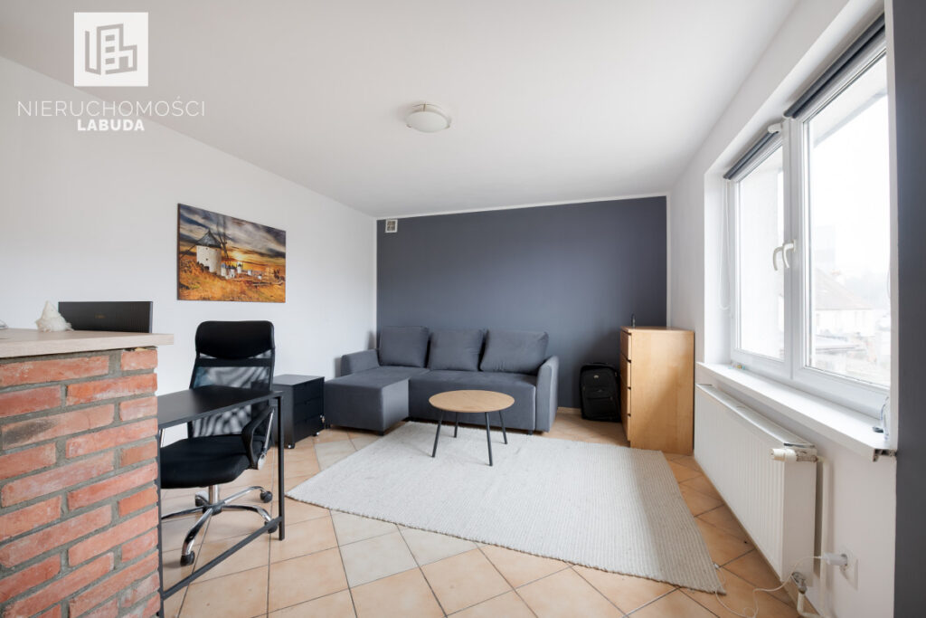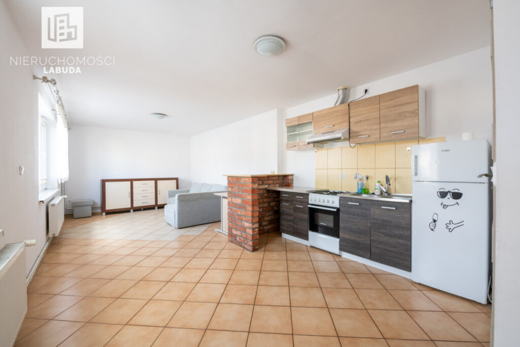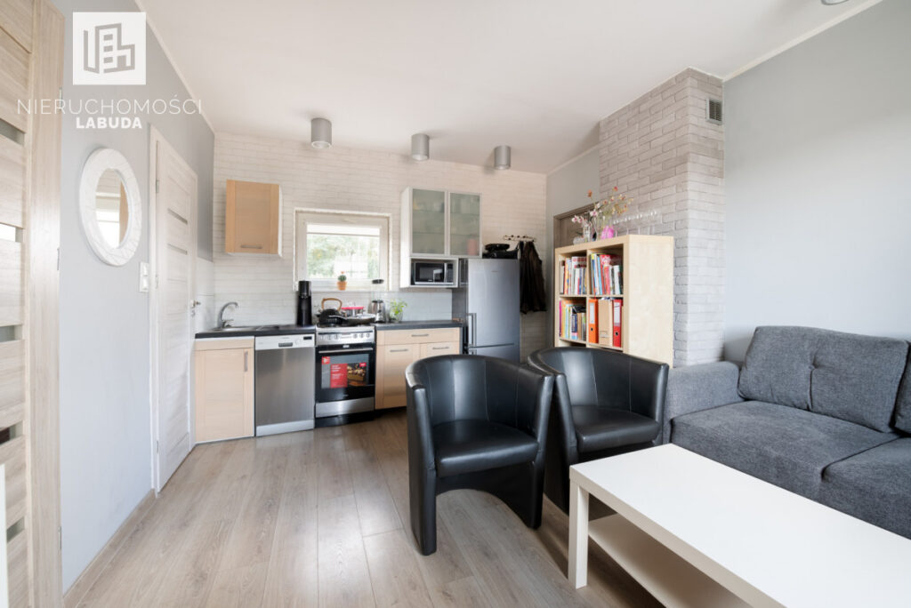 - Mieszkanie 2 - salon z aneksem kuchennym, osobny pokój i łazienka
