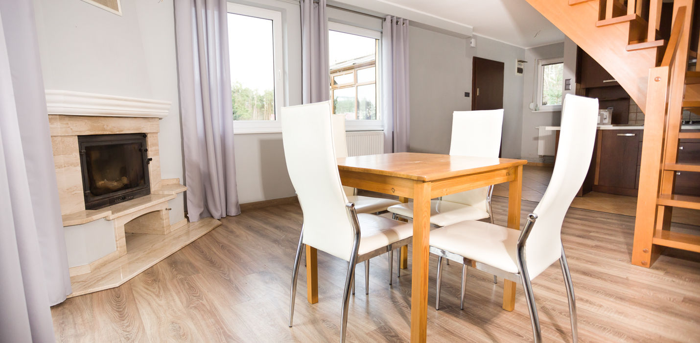 Na parterze znajduje się przestronny salon połączony z aneksem kuchennym, gdzie centralnym punktem jest stylowy kominek, tworzący przytulną atmosferę w chłodniejsze dni. Dodatkowo na tym poziomie znajduje się łazienka oraz urokliwy ogród zimowy, również z kominkiem, który stanowi doskonałe miejsce do relaksu przez cały rok.