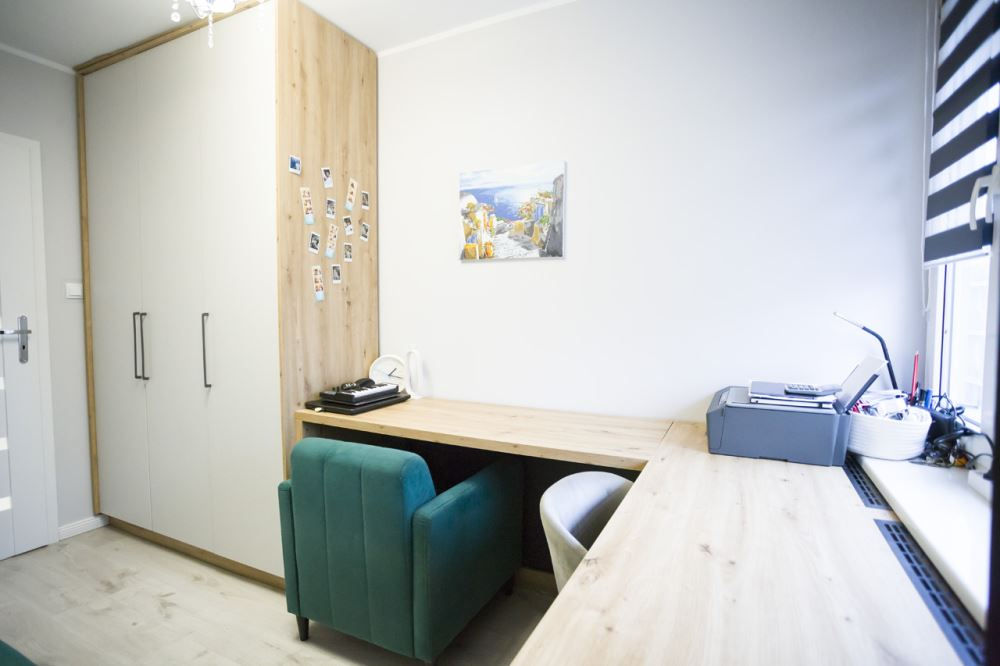 Częściowo umeblowane, w mniejszym przedsionku znajduje się szafa w zabudowie z wieszakiem na kurtki i półką na buty. W łazience oraz kuchni również dostępne są szafki w zabudowie, zwiększające funkcjonalność przestrzeni.